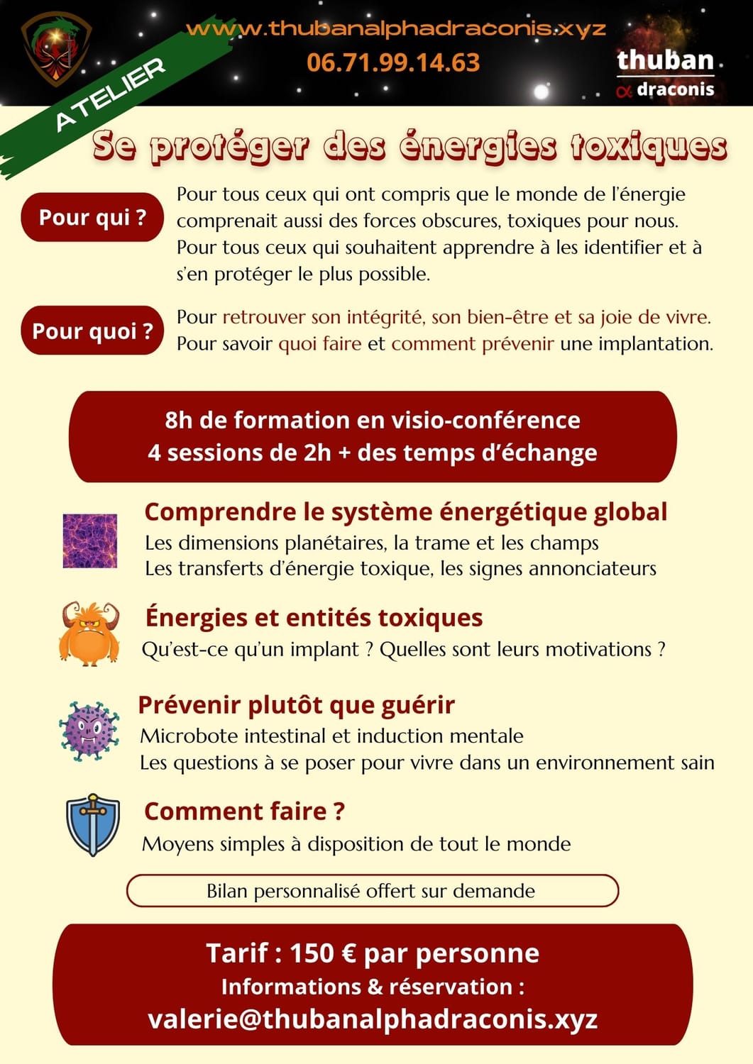 Les thématiques abordées vont de la compréhension du système énergétique global aux solutions de base pour se protéger des énergies toxiques, en passant par une typologie simplifiée de ces énergies et entités toxiques et de leur modes opératoires. La question de l'environnement est aussi posée, ainsi que le lien entre le microbiote intestinal et l'induction mentale. Le but est de comprendre les processus en jeu afin d'apprendre à protéger son intégrité pour garder bien-être et joie de vivre.